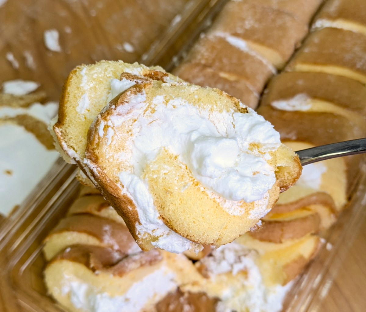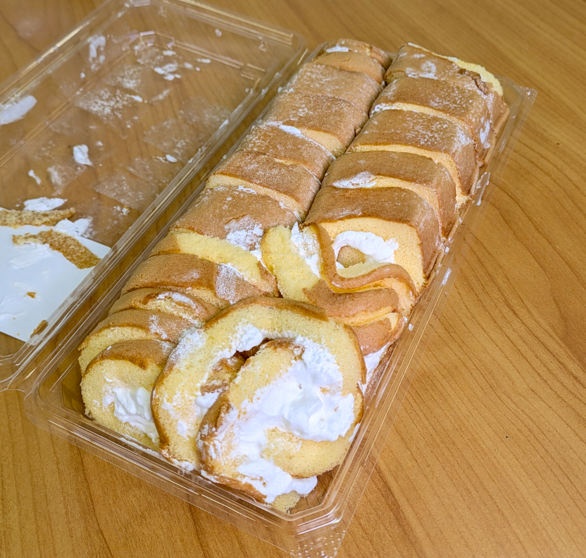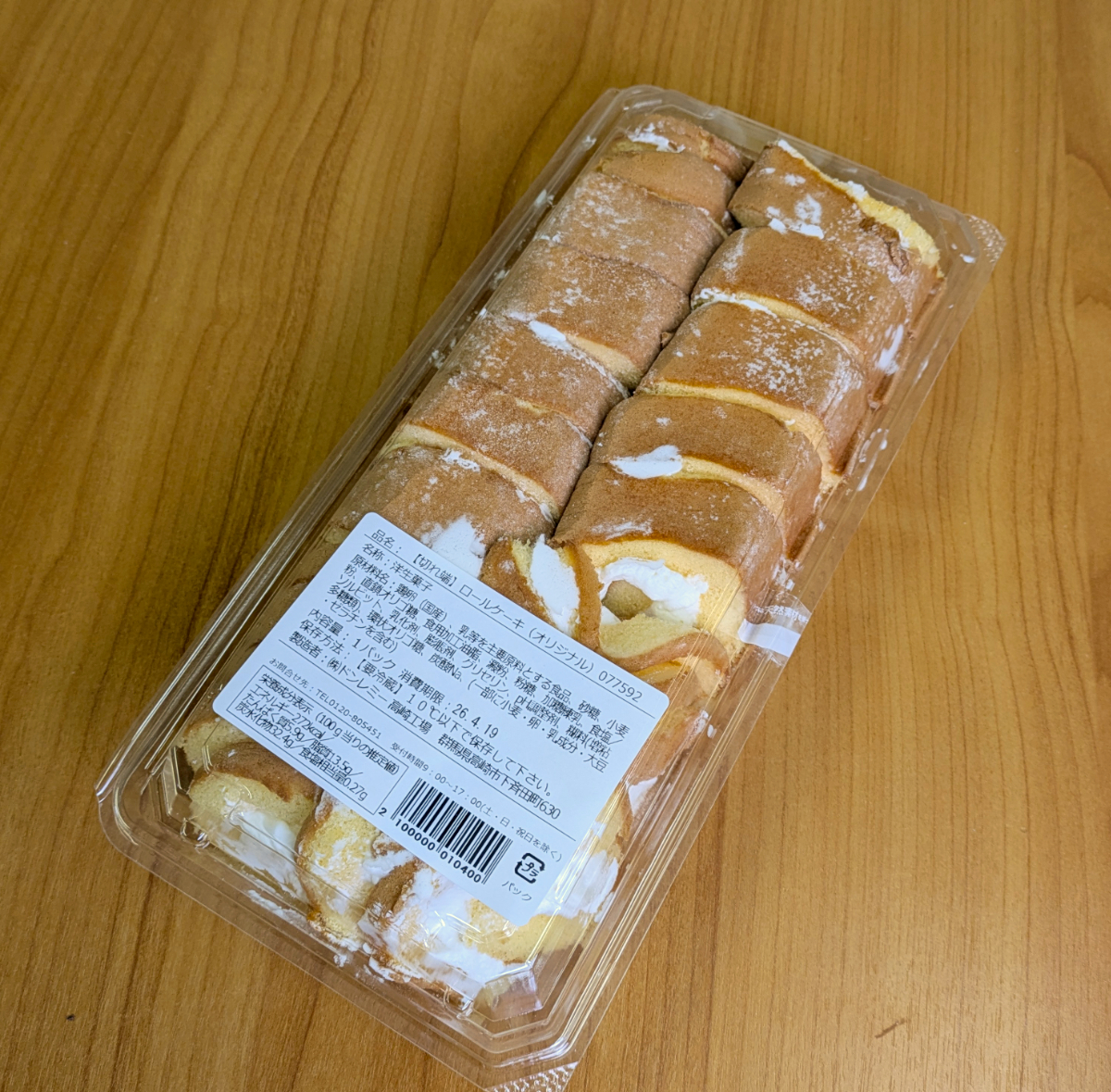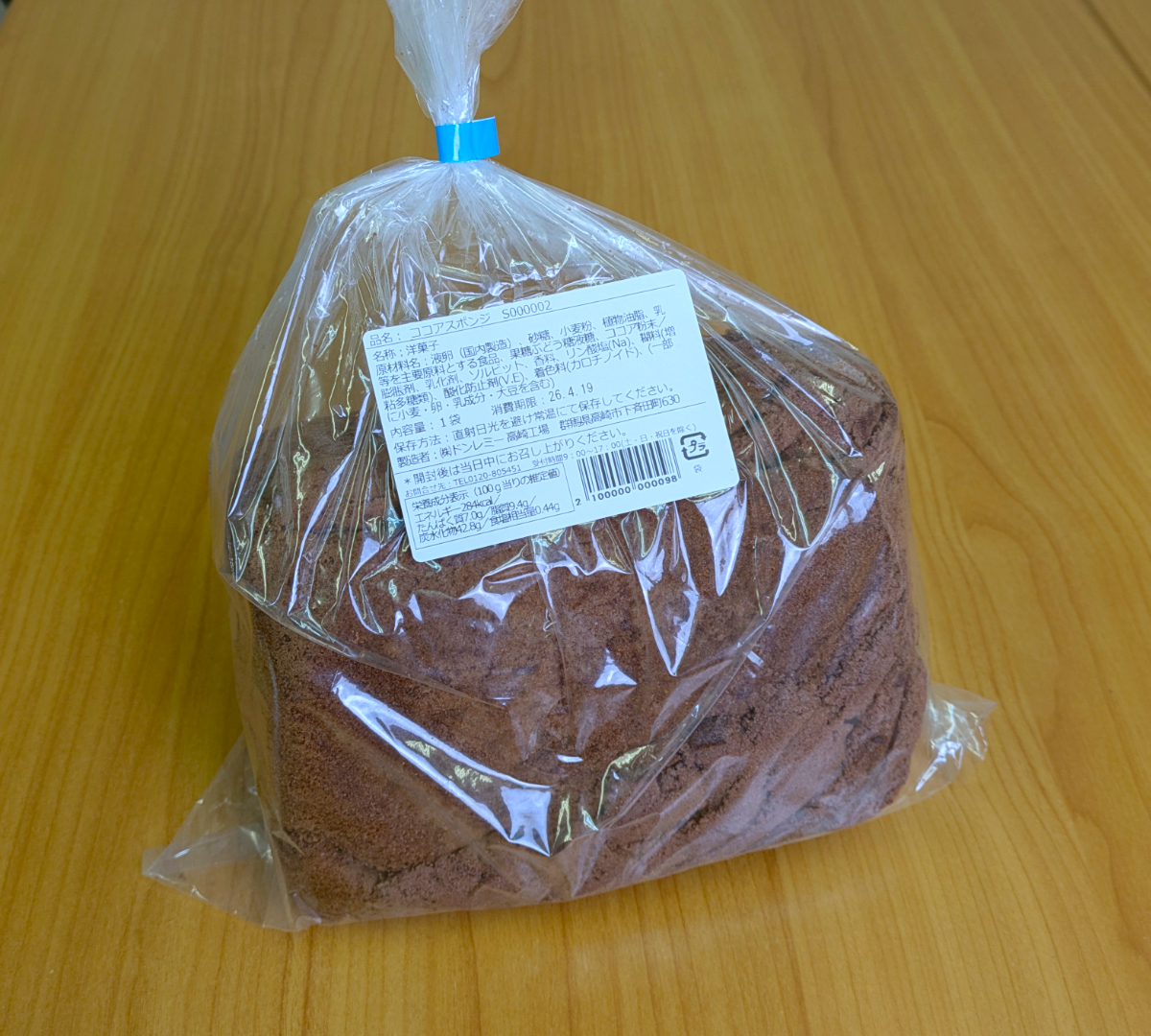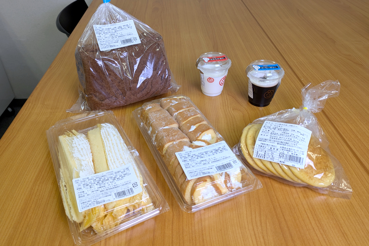 2枚のココアスポンジシートがぐるぐる巻きになっている。驚くのはコレ、1人3品までとなっていた。さすがに3つも消費し切れないので、今日は1個にとどめた。