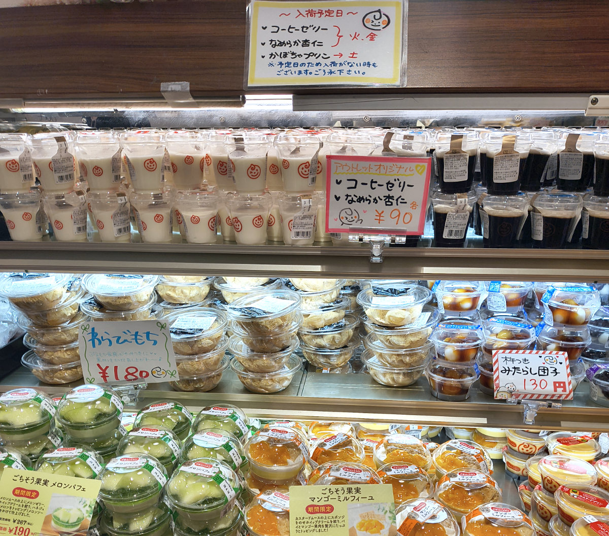 とくに目玉商品のひとつの「コーヒーゼリー」と「なめらか杏仁」は1個税込90円。思わず買いこみたくなるほどお得。ちなみに火・金曜はこの2つが入荷し、土曜日には「かぼちゃプリン」が入って来るとのこと。