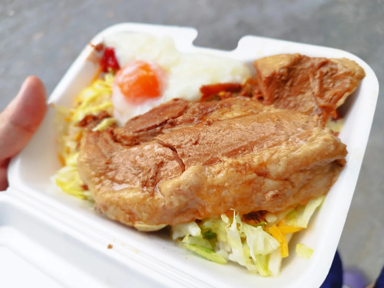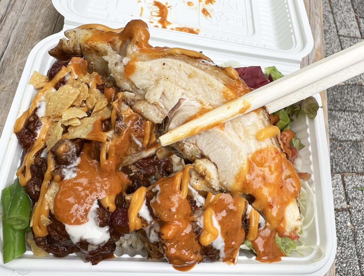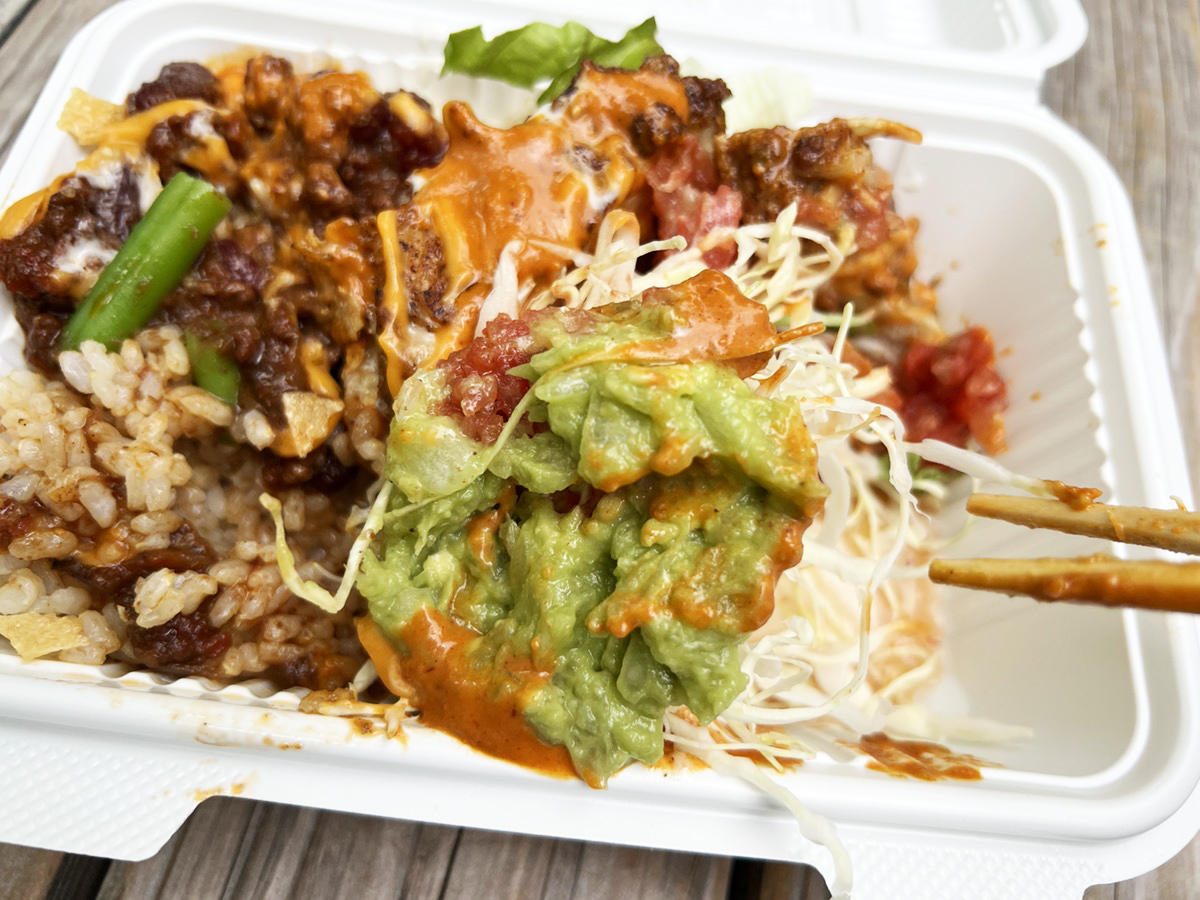 フードパックを覆いつくさんばかりのチキンステーキ。一切れ持ち上げてみるとズッシリ重く、食べてみると、ジューシーな旨みが口いっぱいに広がる。その肉々しさはまさしく失われたはずのタコライスのニューウェーブ。