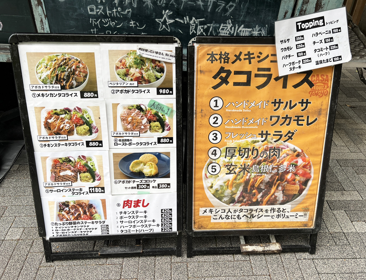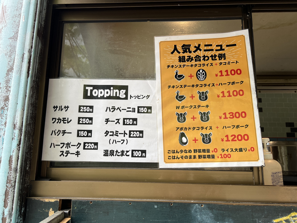 チキン、ポーク、サーロインステーキのタコライスがある。なんなら肉マシまである。ひょっとしてニューウェーブなのか? だが、看板の画像ではそこまでガッツリした内容に見えない。そこで確認のため、人気メニューと書かれていた「チキンステーキタコライス+タコミート(税込1100円)」を購入してみたら……