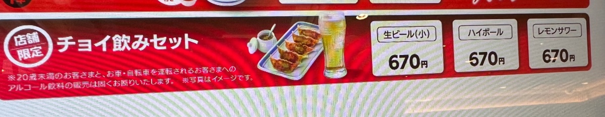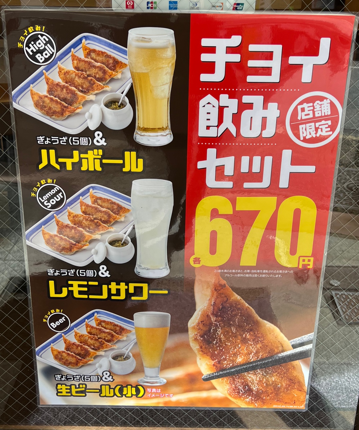 といってもフードはどれも同じで餃子5個と小鉢。ドリンクだけが変わる形で、選択肢はハイボール・レモンサワー・生ビールの3つ。ちなみに、チョイ飲みセット自体は店舗限定となっている。