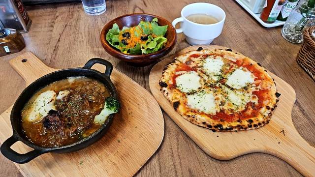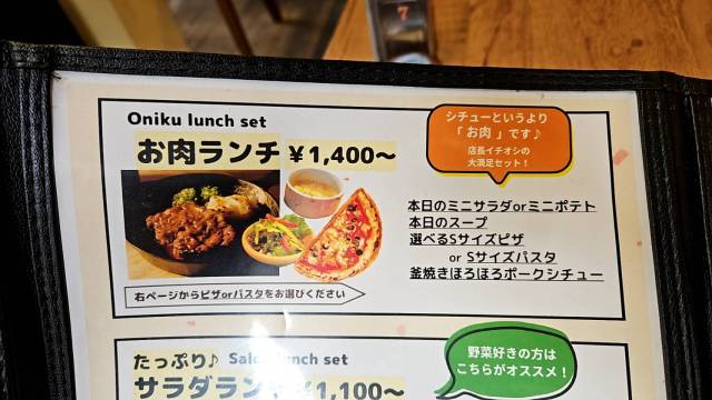 今回は「お肉ランチ(税込1400円)」をチョイス。ピザとポークシチューが楽しめるセットメニューとなっている。
