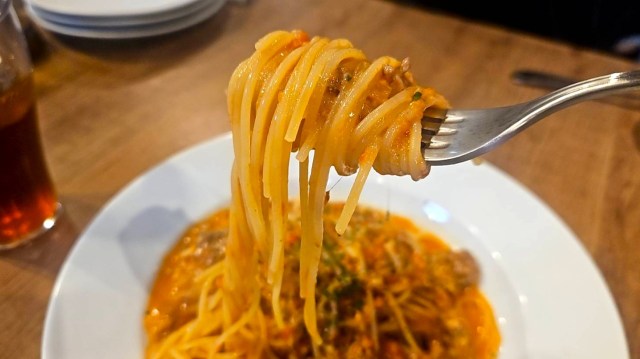 凝縮された挽肉の旨味が凄い。後味にサッパリとしたトマトの強い風味を感じるので、どんどん次が欲しくなる仕上がり。パスタも最高かよ。