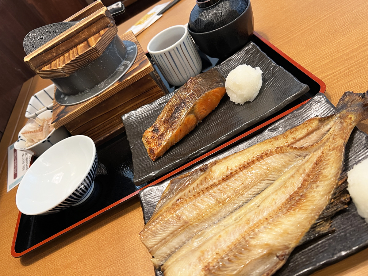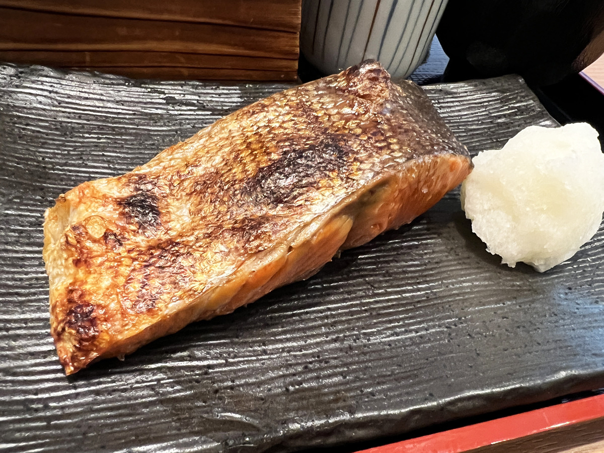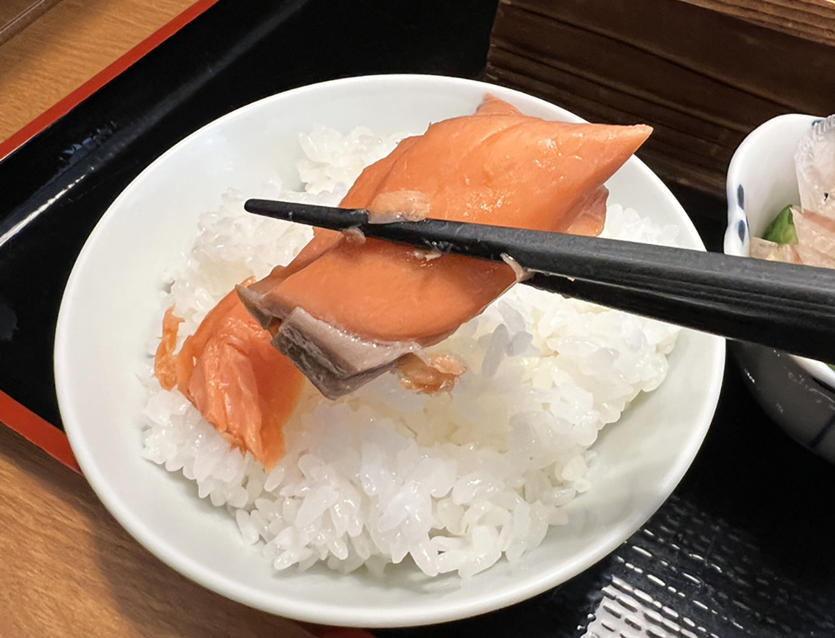 すなわち、旅行者目線でウマイ焼き魚定食の店を探すって難しいのである。そんなタイミングで来た焼き魚だったため、めっちゃウマかった。「厚切り紅鮭ご膳(税込1749円)」の紅鮭の脂が乗った身と塩加減が歩いた体に染み入るようである。