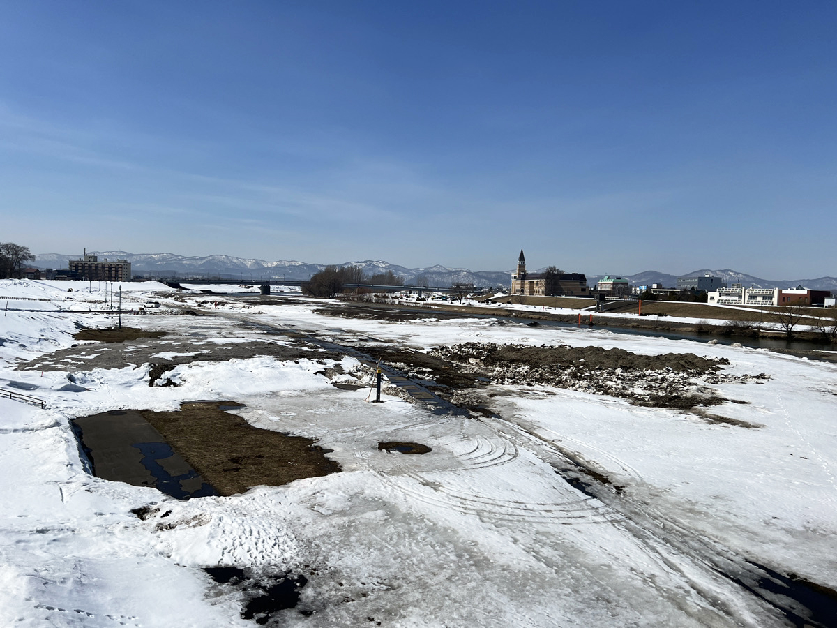 多摩川くらいデカイ橋がかかってて川が流れていた。この川は石狩川。大雪山から流れて石狩湾までいく石狩川は流域面積が全国2位で、日本三大河川のうちの一つなんだとか。