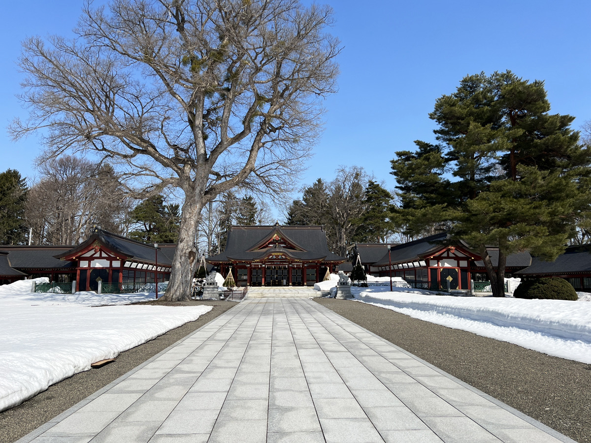 そんな石狩川を越えてしばらく歩くと、北海道護国神社があった。赤い柱が白い雪に映えている。