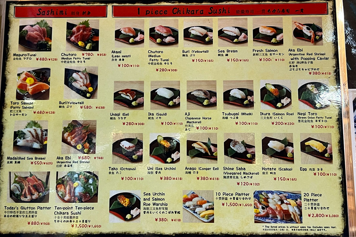 これらは基本的に税抜価格。最初に言っておくと、表の看板にあった寿司100円〜も税抜価格であり、税込だと寿司110円〜だった。