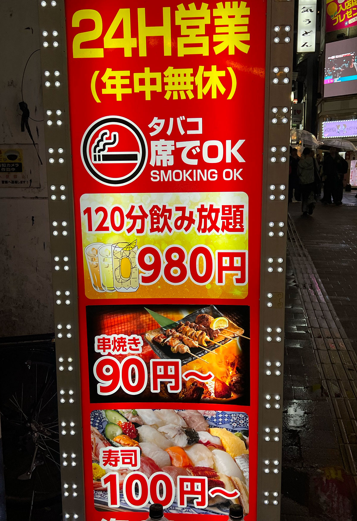さらに気になるのは、看板に書かれているメニューがめちゃくちゃ安いこと。120分飲み放題980円〜、串焼き90円〜、寿司100円〜とあり、歌舞伎町という立地を考えたら激安。安くて嬉しいというより、怖さを感じるレベルかも。